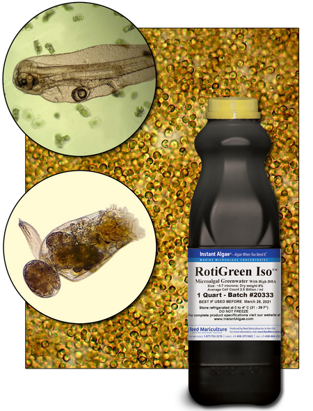 | Rotigreen® Iso | Isochrysis formula. Maintains and can improve the DHA/EPA ratio. High carotenoid levels. | 9% | Refrigerated | 4 Months | 1 quart bottles & 10 liter bags |