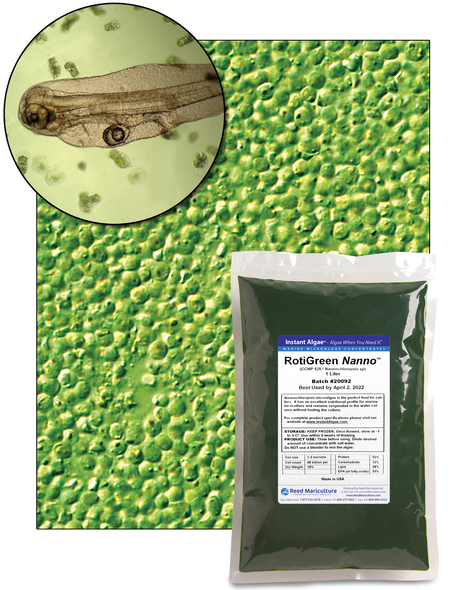 | Rotigreen® Nanno | Nannochloropsis. Traditional greenwater formula, used since 1998. Frozen for long shelf life and easy transportation. Excellent suspension in the water column. Established protocols. | >18% | Frozen | 2 Years | 1 quart bottles, 1 liter bags & 10 liter bags |